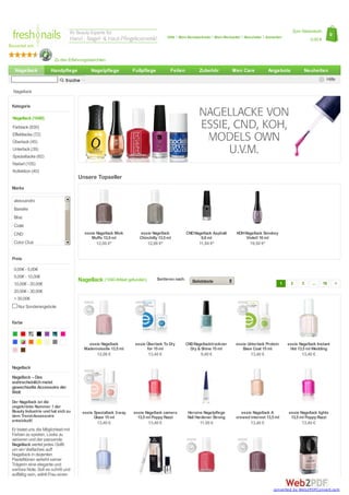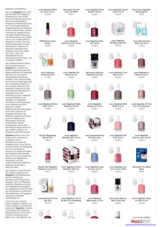 Das Dokument beschreibt ein Online-Shop-Angebot für Nagellack und Pflegeprodukte, einschließlich einer Vielzahl von Marken und Preisen. Es enthüllt die Bedeutung von Unter- und Überlacken zur Verbesserung der Haltbarkeit und des Aussehens von Nagellack sowie deren historische Entwicklung. Außerdem wird die Rolle von Nagellack in der Mode und Kreativität hervorgehoben, mit zahlreichen verfügbaren Farbnuancen und Effekten.