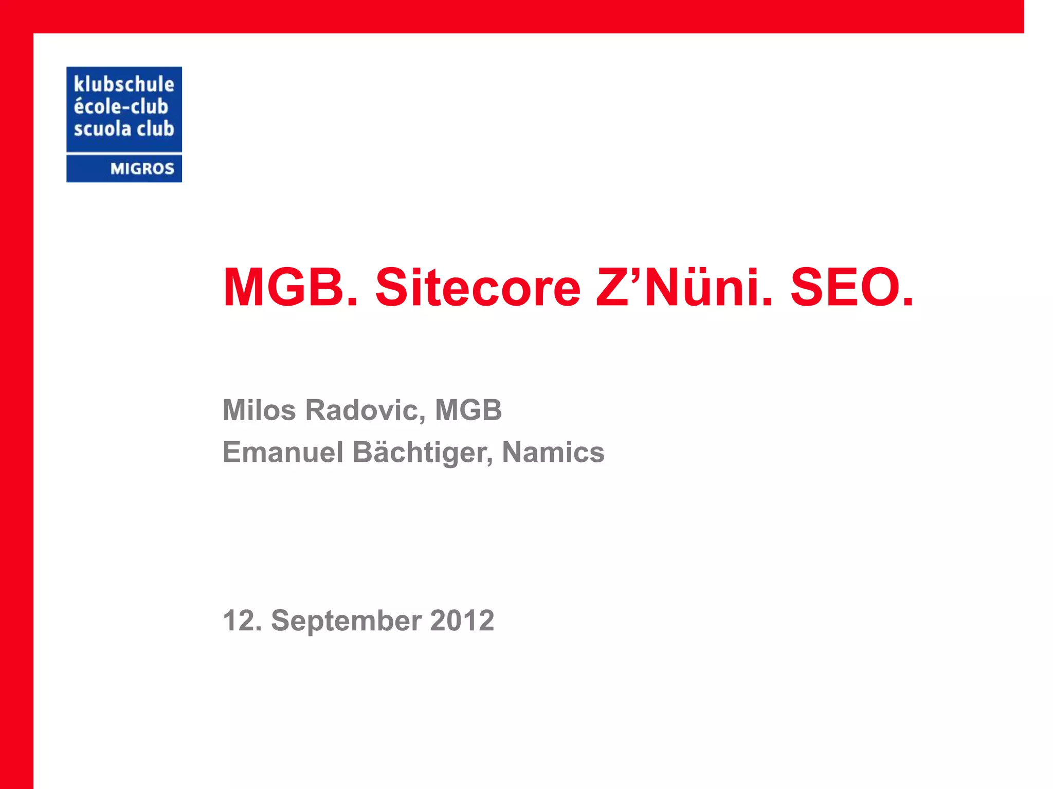 Das Dokument behandelt die Bedeutung der Suchmaschinenoptimierung (SEO) für den Erfolg von Websites und präsentiert Best Practices sowie das SEO-Potenzial der Plattform Sitecore. Es werden spezifische Strategien zur Verbesserung des Rankings, wie Keyword-Recherche, Content-Optimierung und der Umgang mit technischen Herausforderungen wie Duplicate Content und URL-Struktur, beschrieben. Darüber hinaus wird die Notwendigkeit einer kontinuierlichen SEO-Optimierung und die Implementierung geeigneter Analyse-Tools betont.