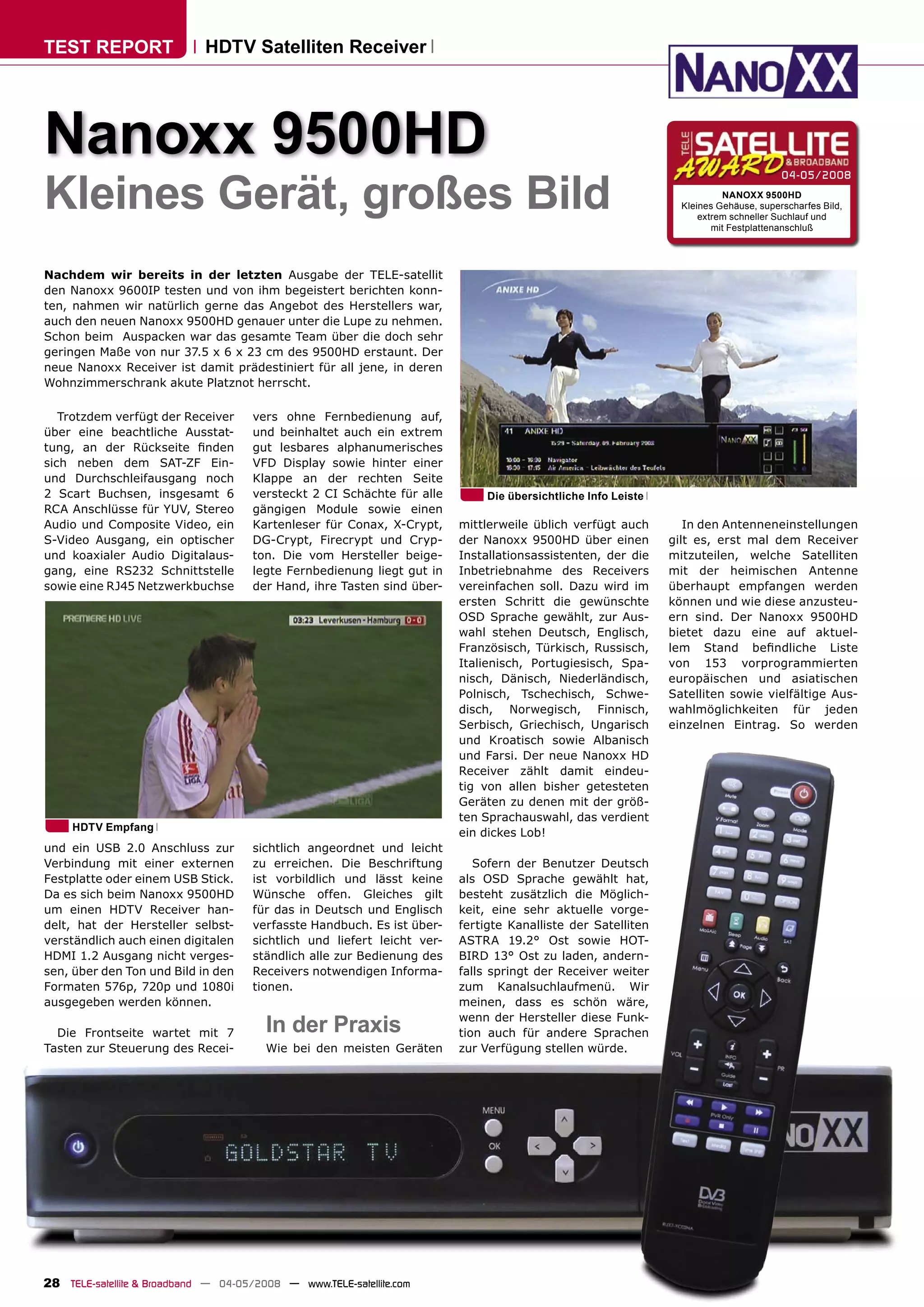 Der Nanoxx 9500HD HDTV Satellitenreceiver zeichnet sich durch sein kompaktes Design und hervorragende Bildqualität aus, bietet eine Vielzahl an Anschlussmöglichkeiten und eine umfangreiche Sprachauswahl. Der Receiver überzeugt mit einem schnellen Suchlauf, einem benutzerfreundlichen Menü sowie integrierten Funktionen wie einem EPG und einer Blindscan-Funktion. Viele Benutzeroptionen sind vorhanden, und die einfache Bedienbarkeit unterstützt die Installation und Nutzung des Geräts.