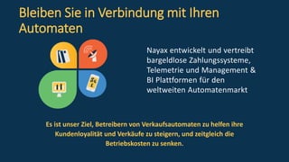 Nayax entwickelt bargeldlose Zahlungssysteme und Telemetrie-Plattformen für den automatisierten Verkaufsmarkt, um Betreibern zu helfen, Kundenloyalität und Verkäufe zu steigern. Mit über 10 Jahren Erfahrung, weltweit mehr als 100.000 Geräte und Unterstützung für 26 Währungen bietet Nayax umfassende Lösungen, darunter mobile Anwendungen und Business-Intelligence-Tools. Das Unternehmen ist in verschiedenen Regionen aktiv und zielt darauf ab, die Betriebskosten zu senken, während es die Nutzung bargeldloser Zahlungen fördert.