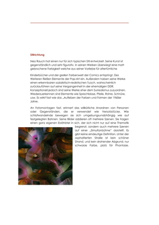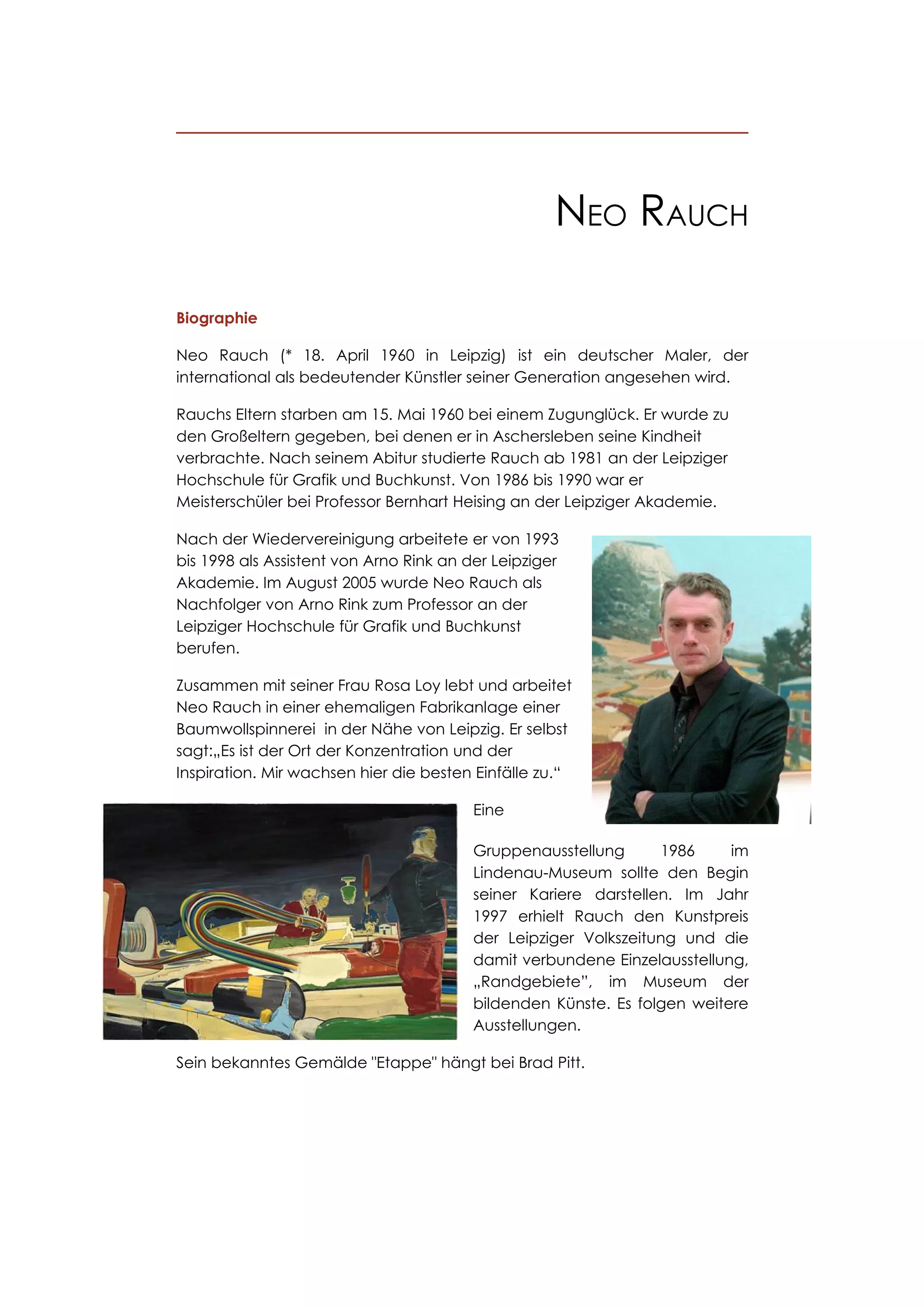 Neo Rauch, geboren am 18. April 1960 in Leipzig, ist ein renommierter deutscher Maler, der einen einzigartigen Stil entwickelt hat, der Elemente der Pop-Art und des Surrealismus kombiniert. Seine Werke, die oft in Gruppenausstellungen und Einzelausstellungen präsentiert werden, sind bekannt für ihre verwobenen Erzählungen und symbolischen Darstellungen, die tiefere gesellschaftliche Themen ansprechen. Neben seiner künstlerischen Tätigkeit ist er als Professor an der Leipziger Hochschule für Grafik und Buchkunst tätig und lebt mit seiner Frau in einer ehemaligen Fabrikanlage.