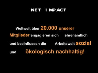 Net Impact Berlin Professional ist ein Netzwerk von über 20.000 Mitgliedern, die sich ehrenamtlich für eine sozial und ökologisch nachhaltige Arbeitswelt engagieren. Es bietet Workshops, Arbeitsgruppen und eine Jobbörse für Mitglieder, die eine sinnvolle Karriere anstreben. Die Mitgliedschaft ist kostenlos und kann einfach online beantragt werden.