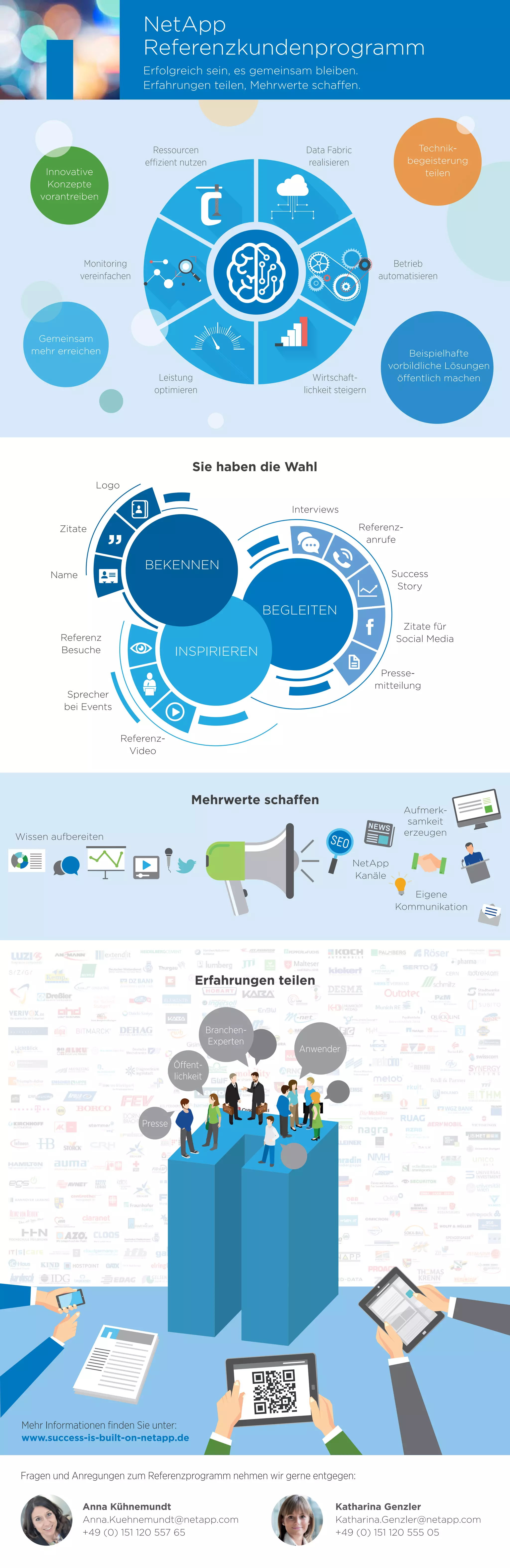 Das Dokument beschreibt den Ansatz von NetApp, innovative Konzepte voranzutreiben und gemeinsame Erfolge durch den Austausch von best practices sowie technischen Lösungen zu fördern. Es hebt die Bedeutung des NetApp Referenzkundenprogramms hervor, um Erfahrungen zu teilen und Mehrwerte zu schaffen. Zudem werden Kontaktmöglichkeiten für Fragen und Anregungen bereitgestellt.