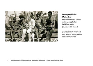 Das Dokument beschreibt die Netnographie als Anpassung ethnographischer Methoden für die Erforschung von Online-Kulturen und Gemeinschaften, wobei verschiedene qualitative und quantitative Methoden kombiniert werden. Es betont die Bedeutung der teilnehmenden Beobachtung sowie die Notwendigkeit, sowohl Online- als auch Offline-Forschung zu integrieren. Darüber hinaus werden Anwendungen der Netnographie in der Marktforschung, insbesondere in der Analyse von Markencommunities und Konsumverhalten, hervorgehoben.