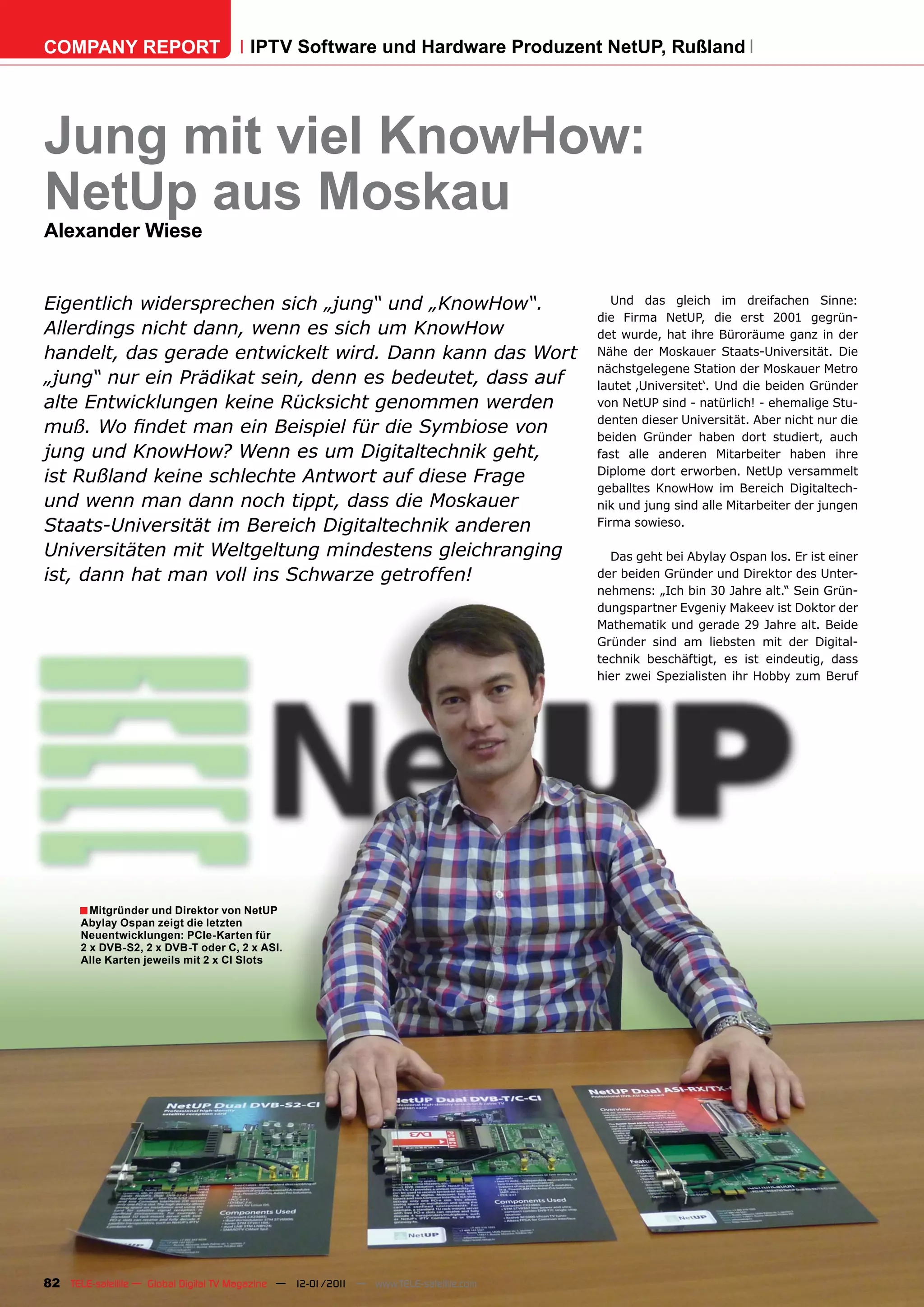 Netup ist ein 2001 gegründetes russisches Unternehmen mit Sitz in Moskau, das sich auf die Entwicklung von Software und Hardware für IPTV-Lösungen spezialisiert hat. Die beiden Gründer, Abylay Ospan und Evgeniy Makeev, verfügen über umfangreiche Kenntnisse in der digitalen Technik und haben bereits über 2000 ISP-Kunden gewonnen. Der Umsatz von Netup stammt heute zu 70% aus dem IPTV-Bereich, während sie innovative Produkte wie PC-Karten für DVB-Streaming und Middleware-Lösungen anbieten.