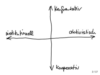Das Dokument erörtert neue Formen des Aktivismus, insbesondere im Kontext von 'tactical urbanism' und gewaltfreien Aktionen zur Bewusstseinsbildung über soziale und Umweltprobleme. Es stellt Fragen zur Zielsetzung, den erforderlichen Vorbereitungen und der Legitimität solcher Aktionen, während es die Bedeutung von Zusammenarbeit und Bündnissen zur Förderung einer nachhaltigen Mobilität und Energiewende betont. Zudem wird auf den Wert von Humor und kreativen Formaten für die Ansprache einer breiten Öffentlichkeit hingewiesen.