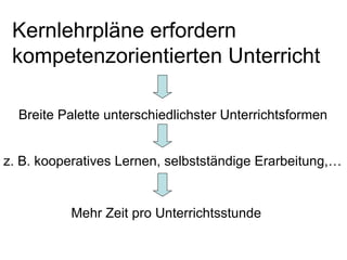 Das Dokument behandelt die Einführung neuer Unterrichtsmodelle im Rahmen der Kernlehrpläne, die kompetenzorientierten Unterricht fördern und verschiedene Langstundenmodelle (z. B. 67,5 Minuten) vorschlagen. Diese Modelle bieten Vorteile wie entlastete Arbeitsstrukturen für Lehrer und Schüler sowie bessere individuelle Förderung, während sie auch Herausforderungen und Umstellungen für die Schulorganisation mit sich bringen. Der Konsens in der Lehrerkonferenz weist darauf hin, dass gemäßigte Modelle die besten Kompromisse darstellen, um Vorzüge zu maximieren und Nachteile zu minimieren.