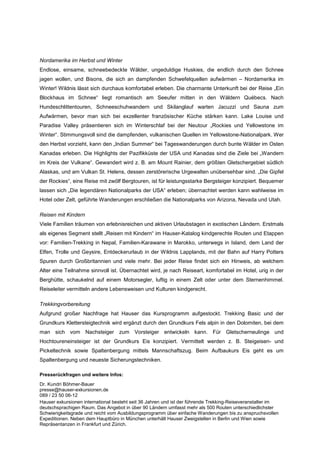 Hauser Exkursionen präsentiert im Katalog 2011 eine breite Palette an Trekkingreisen für unterschiedliche Ansprüche und Budgets, die mehr als 500 Routen in über 90 Ländern umfassen. Neu sind Angebote für Familien, sowie erweiterte Programme für Nepal und Nordamerika. Zusätzlich wurden die Kurse zur Trekkingvorbereitung aufgrund der hohen Nachfrage ausgeweitet.
