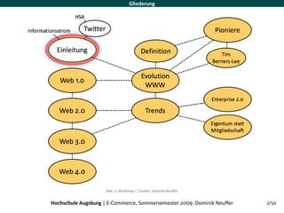 Das Dokument erläutert die Evolution des World Wide Web von den Anfängen bis zu den zukünftigen Entwicklungen, insbesondere die Übergänge von Web 1.0 zu Web 2.0 und Web 3.0. Es werden zentrale Begriffe wie 'Enterprise 2.0' und die Bedeutung mobiler Endgeräte in Entwicklungsländern thematisiert, während auch der Einfluss neuer Technologien und Nutzerinteraktionen beschrieben wird. Zudem wird auf die potenziellen Fortschritte und Herausforderungen im Zusammenhang mit Web 4.0 eingegangen.
