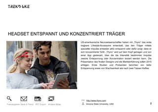 Das Dokument beschreibt innovative Entwicklungen in der Neurotechnologie, darunter tragbare Geräte wie das "thync"-Headset zur Verbesserung von Entspannung und Konzentration sowie Virtual-Reality-Headsets von Mindmaze, die Gehirnaktivitäten messen. Weitere Themen umfassen brain-to-text-Technologien zur Sprachrekonstruktion aus Gehirnströmen, neurostimulativer Schmerzlinderungen ohne Kabel und Anwendungen zur Steuerung von Robotern und Rollstühlen mittels Gedankensteuerung. Insgesamt zeigen die beschriebenen Trends, wie neurologische Erkenntnisse zur Entwicklung neuer Technologien in Medizin und Unterhaltung führen.