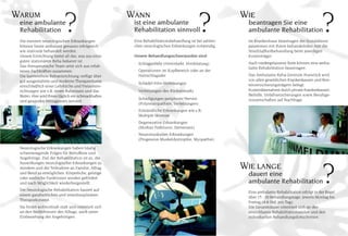 Das Dokument beschreibt die Angebote eines Rehabilitationszentrums für neurologische und orthopädische Behandlungen, einschließlich physikalischer Therapie, Ergotherapie, Logopädie und psychologischer Unterstützung. Es hebt die Bedeutung von ambulanter Rehabilitation hervor, die individuell auf Patientenbedürfnisse abgestimmt ist, und bietet Informationen zu Kontaktmöglichkeiten und Behandlungen bei verschiedenen neurologischen Erkrankungen. Zudem wird ein kostenfreier Fahrdienst und eine moderne, barrierefreie Einrichtung erwähnt.