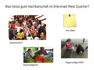 Der Neuzüger Apéro im Erlenmatt West Quartier thematisiert gute Nachbarschaft, gegenseitige Hilfe und Nachhaltigkeit. Veranstaltungsinhalte umfassen mehrere Impulsreferate und eine Informationsveranstaltung, gefolgt von Führungen und einem gemeinsamen Essen. Die Senevita AG stellt ihre Einrichtungen und Dienstleistungen für Senioren vor, während lokale Projekte und Aktivitäten zur Stärkung der Gemeinschaft hervorgehoben werden.