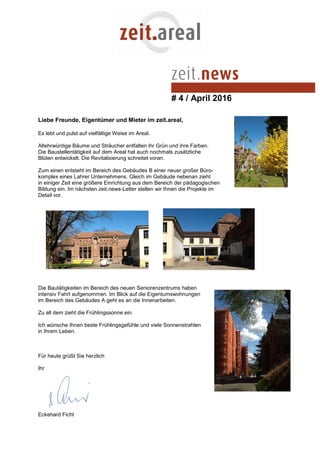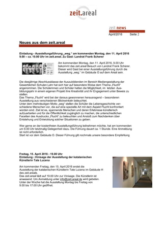Im Zeit.Areal finden umfangreiche Bautätigkeiten statt, darunter ein neuer Bürokomplex und ein Seniorenzentrum, während die Innenarbeiten für Eigentumswohnungen in Gebäude A laufen. Am 11. April 2016 gibt es eine Ausstellungseröffnung mit dem Thema 'Flucht', und am 15. April endet die Ausstellung der katalanischen Künstlerin Tate Lucena. Zudem wird am 21. April eine Theateraufführung 'Afrika' präsentiert, die Ergebnisse eines integrativen Projektes mit Flüchtlingen und Migranten zeigt.
