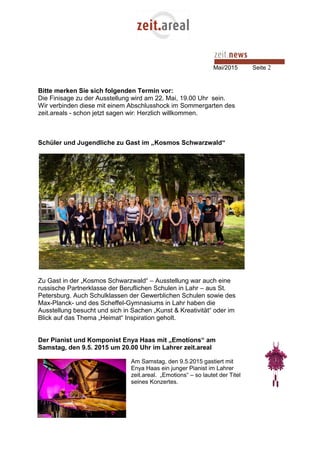 Die "Kosmos Schwarzwald"-Ausstellung im zeit.areal endet am 15. Mai 2015, nach 3000 Besuchern seit der Eröffnung im März. Es finden zusätzliche Führungen und ein Abschluss-Event am 22. Mai statt, während am 9. Mai ein Konzert mit dem Pianisten Enya Haas angeboten wird. Zudem wird die Szene 2wei inklusive Tanzkompanie am 3. Juli 2015 eine Performance im zeit.areal präsentieren und es werden Materialien für deren Räumlichkeiten gesucht.