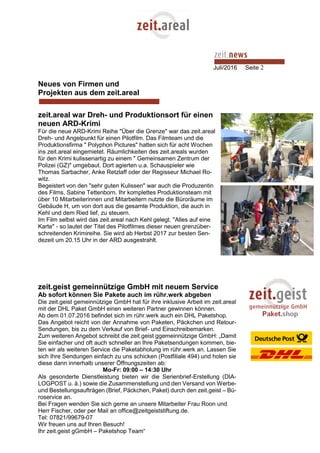 Im Zuge der Revitalisierung des zeit.areals in Lahr sind bedeutende Fortschritte zu verzeichnen, darunter die Ansiedlung der llombart Handels- und Treuhandelsgesellschaft sowie einer evangelischen Fachschule für Sozialpädagogik. Das Areal diente zudem als Kulisse für einen neuen ARD-Krimi und bietet mit dem neuen DHL-Paketshop und weiteren Dienstleistungen Dienstleistungen für die Anwohner. Des Weiteren wird ein Kochbegeisterter Männerclub gegründet und es werden Kunstwerke des Künstlers Franzjoseph Held im Außenbereich des Areals präsentiert.