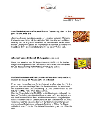 Im August 2017 findet im Zeit.Areal ein Masterclass-Kurs der International Fryderyk Chopin Music Academy mit 14 Studenten aus Korea und Professoren aus Polen und den USA statt, dessen Abschlusskonzert am 12. August um 19 Uhr stattfindet. Am 10. August lädt das Rühr.Werk zu einer After-Work-Party ein und bleibt für Umbauarbeiten vom 21. August bis 8. September geschlossen. Zudem wird am 29. August der Bundesminister Dr. Gerd Müller im Zeit.Areal zu Gast sein, um den Marshallplan für Afrika vorzustellen.