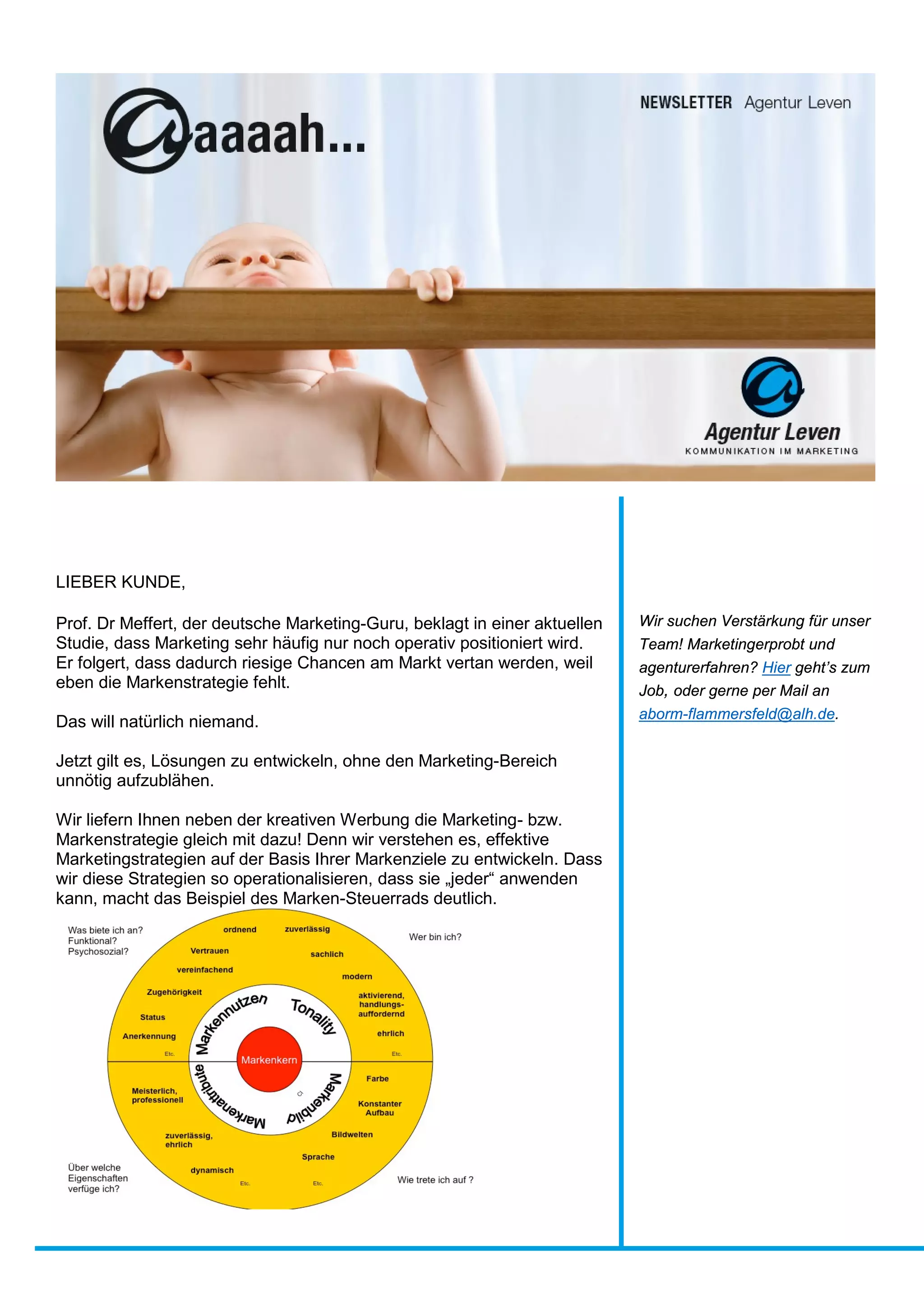 Prof. Dr. Meffert kritisiert in einer Studie, dass Marketing oft nur operativ ausgerichtet ist, was zu verpassten Chancen führt, weil die strategische Ausrichtung fehlt. Die Agentur Leven bietet kreative Werbung und Marketingstrategien an, die auf die Markenziele ihrer Kunden abgestimmt sind. Zudem wird Unterstützung für das Team gesucht und es wird zu einem direkten Austausch eingeladen.