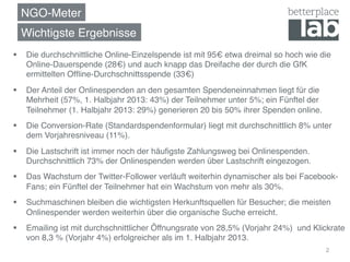 Das ngo-meter dient der Entwicklung einer Benchmark für Online-Fundraising, an der 15 NGOs teilnehmen und ihre Leistung messen können. Die Studie zeigt, dass die durchschnittliche Online-Einzelspende bei 95 € liegt, während der Anteil der Onlinespenden an den Gesamteinnahmen vieler Organisationen unter 5% bleibt. Wichtige Ergebnisse umfassen auch steigende Öffnungs- und Klickraten bei Emailings sowie der anhaltende Erfolg von Google-Suchen als Hauptquelle für Website-Besucher.