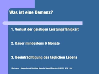 Der Vortrag von Dr. med. Rainer Zerfaß auf dem Niederrheinischen Pflegekongress 2012 behandelt das Thema Demenz, insbesondere die Alzheimer-Krankheit, und deren Symptome sowie Risikofaktoren. Es wird auf die Unterschiede zwischen verschiedenen Demenzarten eingegangen und es werden Ansätze zur Prävention sowie medikamentöse und psychosoziale Behandlungsmöglichkeiten vorgestellt. Wichtige Risikofaktoren sind neben genetischen Faktoren auch Lebensstilfaktoren wie Ernährung und soziale Kontakte.