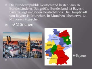 Die Bundesrepublik Deutschland besteht aus 16 Bundesländern, wobei Bayern das größte ist und dessen Hauptstadt München etwa 1,4 Millionen Einwohner hat. Jährlich zieht das Oktoberfest fast 6 Millionen Touristen an, und München bietet zahlreiche Sehenswürdigkeiten wie die Frauenkirche, das Rathaus am Marienplatz, das BMW-Museum und die Allianz Arena. Bayern München ist der lokale Fußballverein, der eng mit der Stadt verbunden ist.