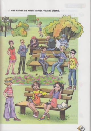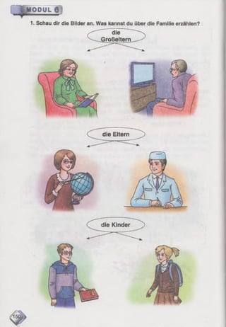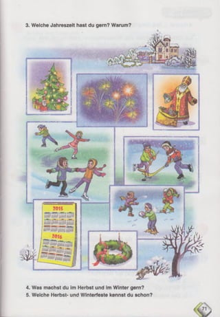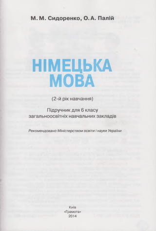 Das Dokument ist ein Lehrbuch für die deutsche Sprache, das für den zweiten Lernjahrgang in der 6. Klasse empfohlen wird. Es umfasst sieben Kapitel mit verschiedenen Übungen zur Förderung der Sprachfähigkeiten in Hörverstehen, Lesen, Sprechen und Schreiben sowie zusätzliche Materialien wie einen Grammatikleitfaden und ein deutsch-ukrainisches Wörterbuch. Der Unterricht zielt darauf ab, grundlegende Sprachkenntnisse zu vermitteln und die Schüler auf eine interaktive und unterhaltsame Weise in die deutsche Sprache einzuführen.