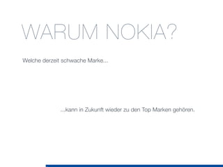 Die Präsentation von Oliver Scherrer thematisiert die Schwierigkeiten von Nokia auf dem Mobiltelefonmarkt und zeigt Potenziale für eine Rückkehr zu den Top-Marken auf. Durch strategische Neuausrichtungen, wie individuelleres Design und stärkeren Service, sollen sowohl Absatz als auch Umsatz in wichtigen Märkten gesteigert werden. Die Präsentation schließt mit dem Ziel, Nokias Image als Vorreiter in der Branche zu stärken und die Kundenbindung zu erhöhen.