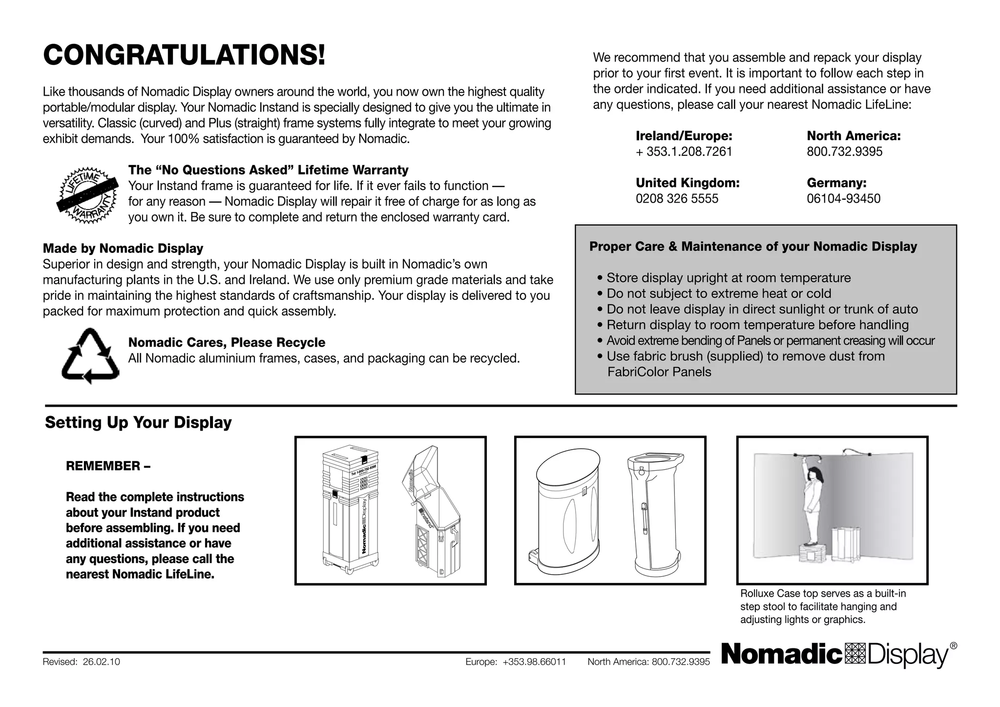 Das Dokument beschreibt die Montage und Pflege des Nomadic Instand Displays, einschließlich Anleitungen zur Verwendung des Rolluxe-Behälters als Steighilfe. Es hebt die Flexibilität und die lebenslange Garantie hervor, die eine kostenlose Reparatur bei Ausfall garantiert. Zudem werden umweltfreundliche Recyclinghinweise für Materialien und Verpackungen gegeben.