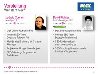 Das Dokument behandelt nicht-technische SEO-Strategien für Redakteure der Deutschen Telekom, fokussiert auf die Integration von SEO in redaktionelle Workflows und die Optimierung von Inhalten für Shops durch besseres Nutzerverständnis. Es umfasst verschiedene Phasen des Content-Lifecycles, einschließlich Seeding, Release und Post-Release, und betont die Wichtigkeit, Nutzerbedürfnisse zu verstehen und darauf basierende Inhalte zu erstellen. Tipps für die Redaktion im Shop-Umfeld werden ebenfalls gegeben, um Conversion und Nutzerbindung zu fördern.