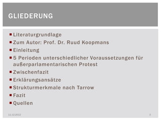 Das Dokument behandelt die Entwicklung neuer sozialer Bewegungen in Westdeutschland, einschließlich der politischen Rahmenbedingungen, in denen sie entstanden sind, sowie der Rolle der SPD als potenzieller Verbündeter. Es werden fünf Perioden des außerparlamentarischen Protests beschrieben, die unterschiedliche politische Herausforderungen erlebten, und die Auswirkungen von Repressionen sowie der Integration konservativer Politiken werden analysiert. Abschließend werden verschiedene Erklärungsansätze für das Verhalten und die Dynamik dieser sozialen Bewegungen sowie deren Vergleich mit anderen Ländern untersucht.