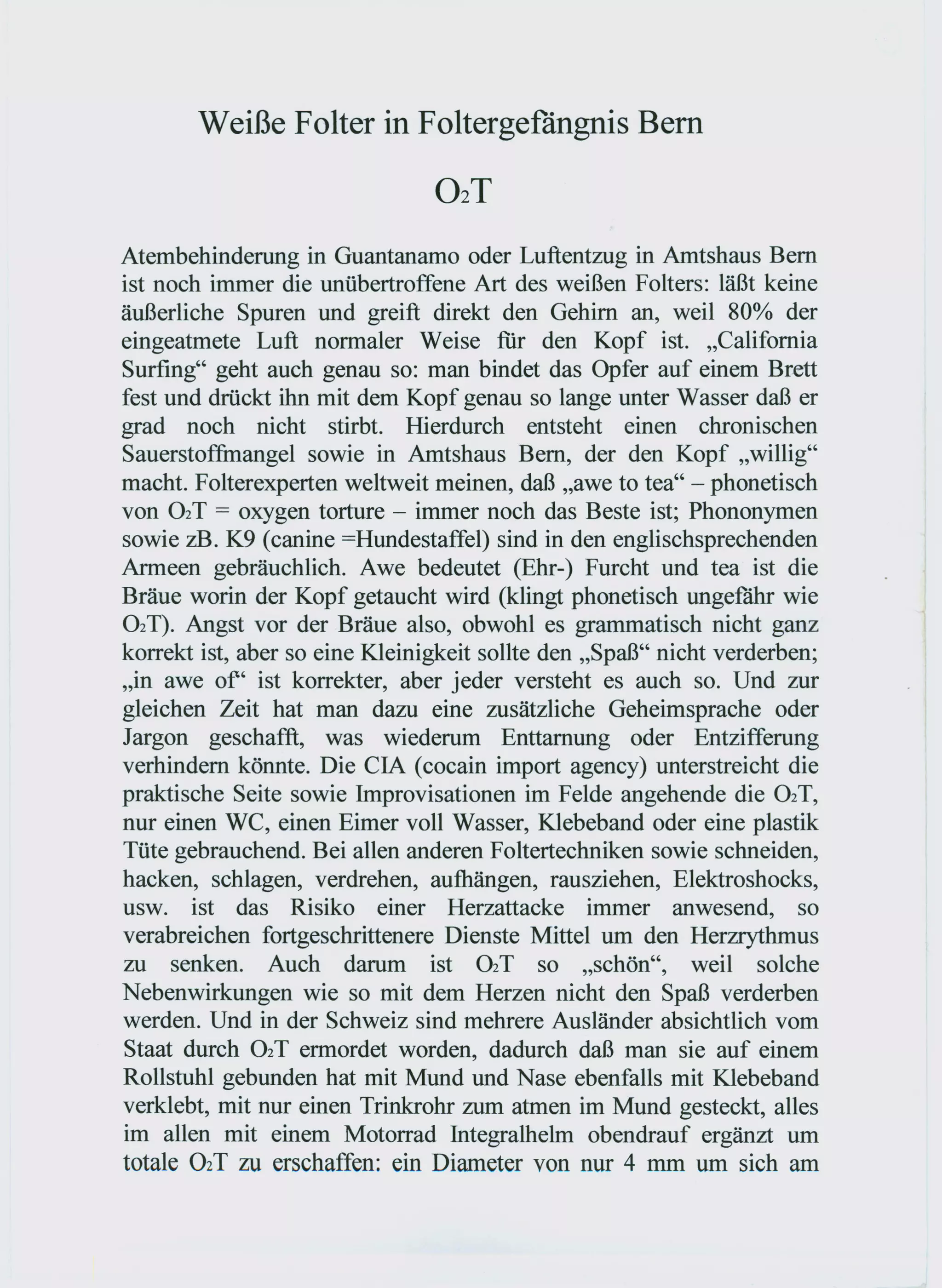 Das Dokument beschreibt die Methoden und Auswirkungen von 'weißer Folter', insbesondere durch Atementzug und Sauerstoffmangel, die in geheimen Gefängnissen, darunter in Guantanamo und der Schweiz, praktiziert werden. Es wird behauptet, dass diese Foltermethoden chronische Schäden am Gehirn und am Körper des Opfers verursachen und die betroffenen Personen bis zur Debilität oder sogar zum Tod führen können. Zudem wird eine Verbindung zu politischen Akteuren und geheimdienstlichen Praktiken gezogen, die für diese Vergehen verantwortlich gemacht werden.