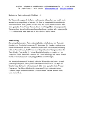 Die zehnte kulinarische Weinwanderung in Oberkirch findet am 27. September statt und bietet einen Rundkurs von sieben Kilometern mit sieben Stationen, inklusive der historischen Burgruine Schauenburg. Der Weinwanderpass, erhältlich für 10 Euro (9 Euro im Vorverkauf), umfasst Sekt, fünf Weine, einen Digestif und ein Weinglas, während kulinarische Häppchen zusätzlich zu einem sechsgängigen Menü kombiniert werden können. Die Wanderwege sind ganzjährig zugänglich, gut ausgeschildert und familienfreundlich, mit einem speziellen Pass für ein viergängiges Menü von April bis Oktober für 35 Euro.