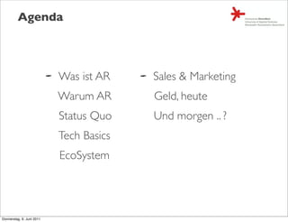 Augmented Reality (AR) wird als computergestützte Erweiterung der realen Welt beschrieben und findet Anwendung in verschiedenen Branchen, insbesondere im Verkauf und Marketing. Der Status von AR ist dynamisch, mit sich verändernden Lizenzmodellen und steigender technischer Leistungsfähigkeit, die neue Geschäftsmodelle für B2C- und B2B-Umgebungen ermöglicht. Die Zukunft von AR umfasst Entwicklungen wie Sensorfusion, Gerätekontakt ohne Zwischenserver und neue Möglichkeiten in sozialen Medien und multimedialen Interaktionen.