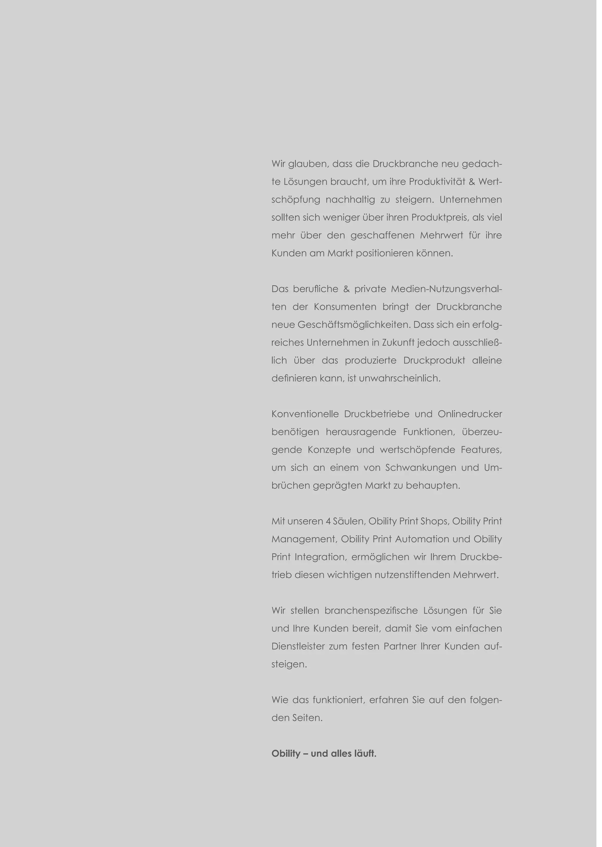 Das Dokument beschreibt die obility-Lösungen, die die Druckbranche dabei unterstützen, ihre Produktivität und Wertschöpfung zu steigern, indem sie den Fokus auf den Mehrwert für Kunden legen. Durch vier zentrale Säulen – Print Shops, Print Management, Print Automation und Print Integration – wird ein umfassendes System angeboten, das die verschiedenen Aspekte des Druckprozesses optimiert, vom Web-to-Print bis zur Automatisierung interner Abläufe. Dabei wird betont, dass die Nutzung modernster Technologien und individuelle Anpassungsmöglichkeiten für eine erfolgreiche Marktpositionierung entscheidend sind.