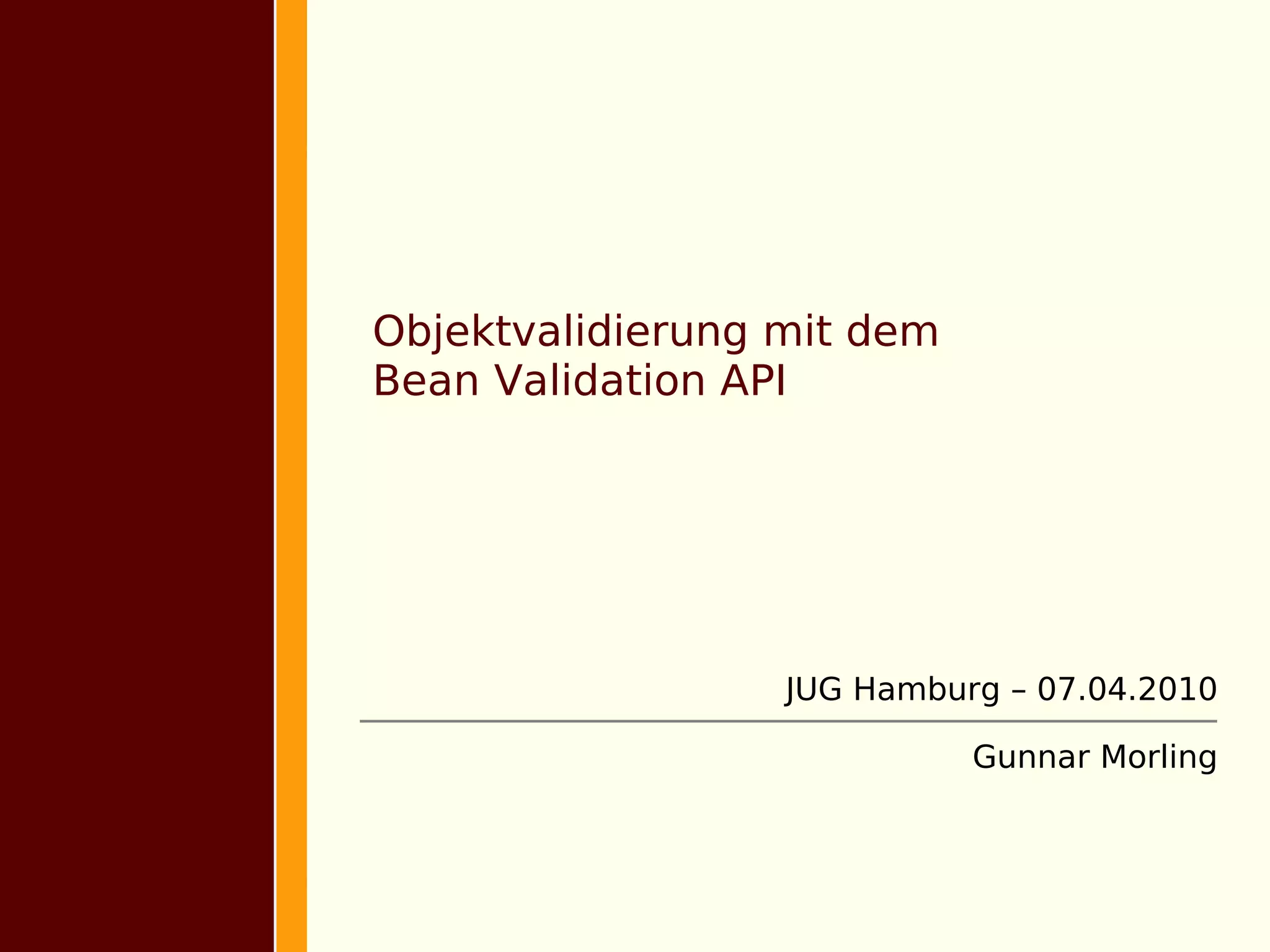Die Präsentation beschreibt die Verwendung der Bean Validation API, die eine zentrale Validierung von Objekten in Java ermöglicht, um Redundanzen und Inkonsistenzen zu vermeiden. Sie behandelt die Definition und Auswertung von Constraints, Gruppenvalidierung und die Integration mit anderen Java-Technologien wie JPA und JSF. Zu den vorgestellten Funktionen gehören vordefinierte und benutzerdefinierte Constraints sowie die Möglichkeiten zur Konfiguration der Validierung.