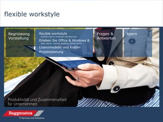 Das Dokument präsentiert den flexiblen Arbeitsstil und die verschiedenen Lizenzmodelle von Microsoft Office 365, um Unternehmen bei der Produktivität und Zusammenarbeit zu unterstützen. Es hebt die Bedeutung von Cloud-Technologien und mobilen Endgeräten hervor, sowie deren Einfluss auf die Arbeitsweise von Mitarbeitern. Zudem werden verschiedene Unternehmenslösungen sowie Preismodelle für unterschiedliche Zielgruppen dargestellt.