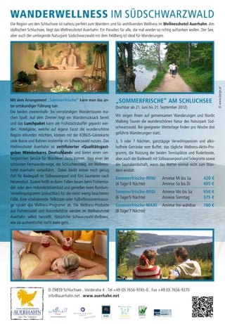 Das Dokument beschreibt die Freizeitmöglichkeiten in der Region um den Schluchsee, ideal für Wandern und Wellness im Wellnesshotel Auerhahn. Es bietet zahlreiche Empfehlungen für Rad- und Wandertouren, Ausflugsziele sowie kulturelle Veranstaltungen im Naturpark Südschwarzwald. Verschiedene Arrangements und Programme im Hotel sorgen für Erholung und aktive Erlebnisse in der Natur.