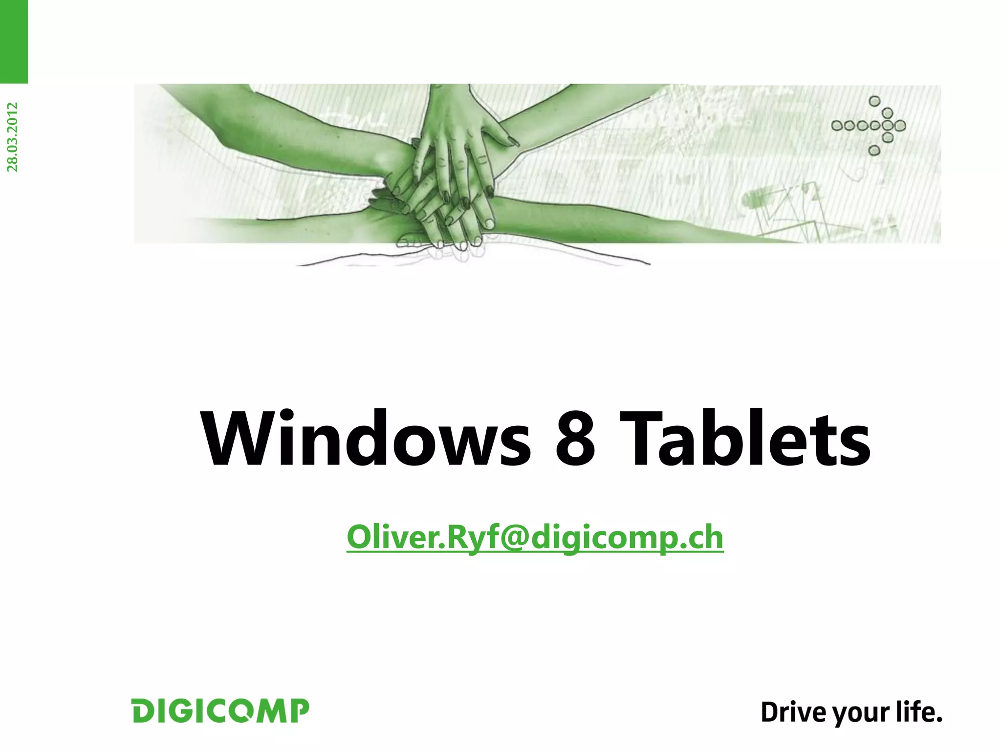 Das Dokument behandelt die Einführung von Windows 8 Tablets und die damit verbundenen Vorzüge für Unternehmen, darunter die Integration in Firmennetzwerke und die Kompatibilität mit Microsoft Office. Es werden verschiedene Funktionen und Vorteile des neuen Betriebssystems sowie der neuen Benutzeroberfläche beschrieben, darunter Dual-Mode-Systeme, Cloud-Ansätze und die Unterstützung von Metro-Style-Apps. Auch die Zukunft des Cloud-Dienstes Skydrive und dessen Rolle in Windows 8 wird thematisiert.