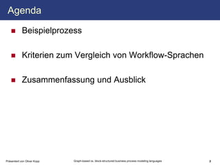 Das Dokument untersucht die Unterschiede und Kriterien zur Vergleichbarkeit von graph-basierten und block-strukturierten Modellierungssprachen für Geschäftsprozesse. Dabei werden verschiedene Prozessmodellierungssprachen wie BPEL, BPMN und EPK betrachtet, und es wird ein Kriterienkatalog vorgestellt, um die Sprachen schnell zu bewerten. Es wird festgestellt, dass nicht jede block-strukturierte Sprache ausschließlich diesen Ansatz verfolgt und dass zudem die Abbildung von BPMN auf BPEL überdacht werden muss.