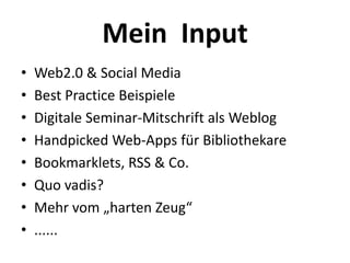 Das Dokument behandelt die Themen Web 2.0 und soziale Medien aus der Perspektive von Bibliothekaren, einschließlich Best-Practice-Beispielen und Tools wie Weblogs und Web-Apps. Darüber hinaus wird darauf hingewiesen, dass soziale Medien Plattformen für den Austausch von Informationen und Erfahrungen sind. Es werden verschiedene Ressourcen und Links präsentiert, um weiterführende Informationen zu erhalten.