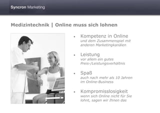 Das Dokument beschreibt die Notwendigkeit für Unternehmen, insbesondere im Bereich Medizintechnik, sich online zu positionieren und eine umfassende Marketingstrategie zu entwickeln. Es bietet einen Überblick über verschiedene Dienstleistungen wie Webdesign, Suchmaschinenoptimierung und Social Media Marketing, die zur Steigerung der Sichtbarkeit und des Erfolgs im Internet beitragen. Die Agentur sycron-marketing gmbh unter der Leitung von Michael Kaindl bietet maßgeschneiderte Lösungen und individuelle Beratung für ihre Kunden an.