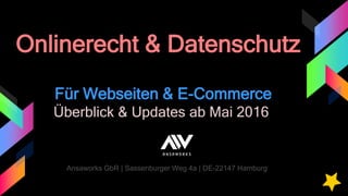 Das Dokument bietet einen Überblick über das Online-Recht und den Datenschutz für Webseiten und E-Commerce in Deutschland, darunter EU-Rechtlinien und wichtige Gesetze wie die Datenschutzerklärung und Impressumspflicht. Es behandelt wesentliche Begriffe und Anforderungen für die rechtliche Compliance von Webseiten. Kontaktinformationen des Ansaworks-Teams für weitere Fragen sind ebenfalls enthalten.