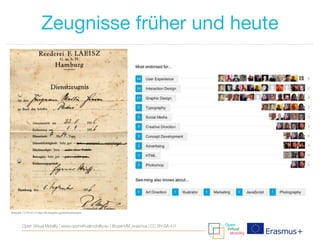 Das Dokument beschreibt die Entwicklung und den Nutzen von virtueller Mobilität im Hochschulbereich, unterstützt durch das Erasmus+-Programm der EU. Es hebt die Bedeutung von Open Badges zur Zertifizierung von Kompetenzen und die Erstellung eines Learning Hubs hervor, der verschiedene Formen virtueller Mobilität fördert. Zudem werden Entwurfsmuster für die Implementierung von Open Badges vorgestellt, die auf digitaler Kompetenz basieren.