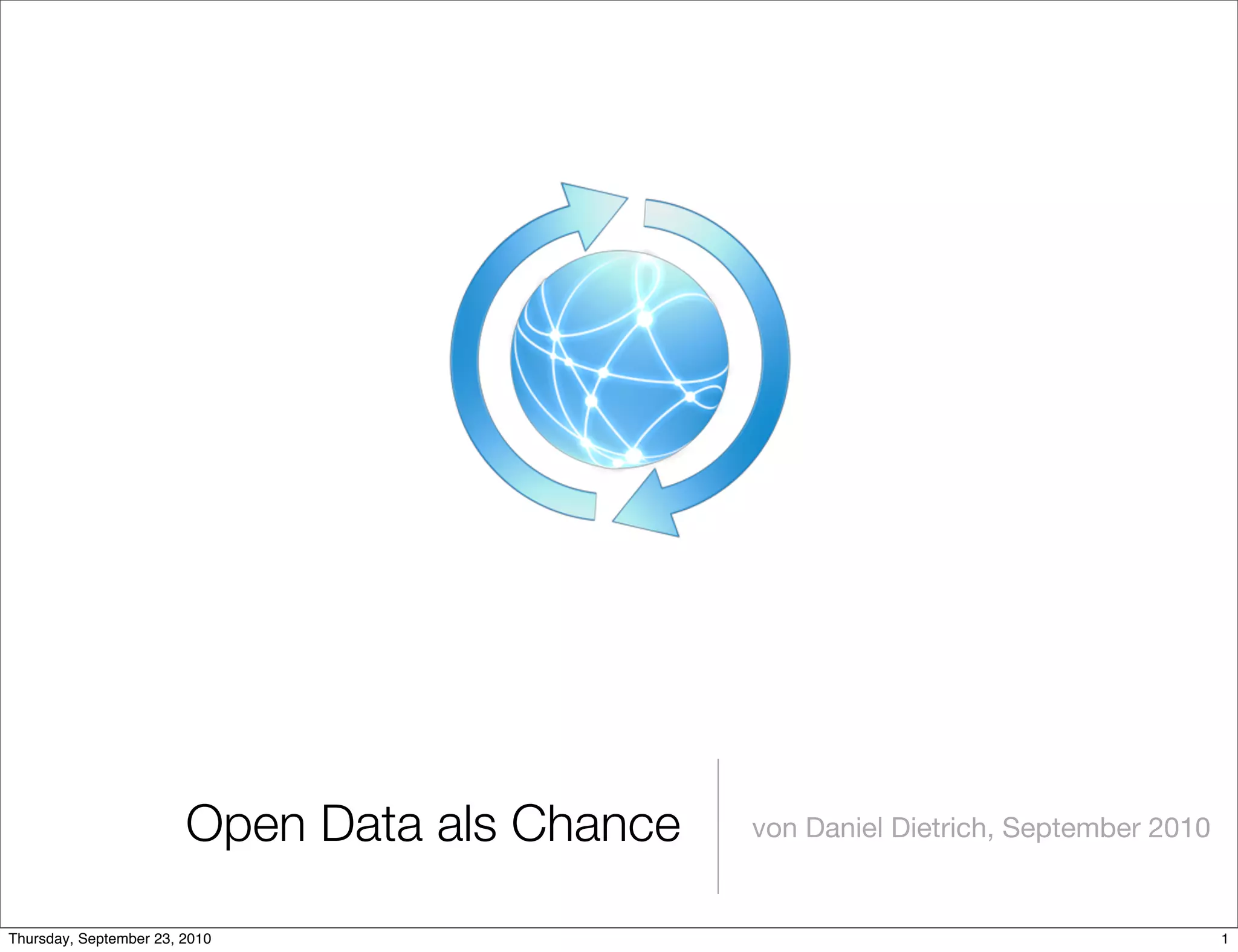 Das Dokument beschäftigt sich mit dem Konzept der offenen Daten (Open Data), die nicht-personenbezogene Informationen des öffentlichen Sektors für die Allgemeinheit zugänglich machen sollen. Es betont die Notwendigkeit von Transparenz, Zusammenarbeit und Innovation, um die Potenziale offener Daten zu nutzen, zudem werden rechtliche und technische Herausforderungen sowie Beispiele für bereits umgesetzte Open Data-Projekte in Deutschland diskutiert.
