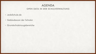 Das Dokument von Thomas Tursics behandelt das Thema Open Data in der Schulverwaltung in Deutschland. Es werden verschiedene Aspekte wie Schulverzeichnisse, den Gebäudescan zur Erhebung des Sanierungsbedarfs in Berliner Schulen sowie Grundschuleinzugsbereiche thematisiert. Zudem werden finanzielle Zahlen zur Sanierungssituation in den Jahren 2012 bis 2017 vorgestellt.