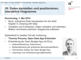 Das Dokument behandelt das Thema 'Open Data', insbesondere die Darstellung und Visualisierung von Daten durch interaktive Diagramme, und enthält Informationen über eine Vorlesung an der Universität Bern. Studierende müssen eine Open Data App entwickeln, die kreative und interaktive Visualisierungen bietet, wobei die Arbeit in Teamarbeit erfolgt und spezifische Bewertungs Kriterien erfüllt werden müssen. Außerdem werden technische Details zu D3.js und Beispielaufgaben zur Prüfung bereitgestellt.