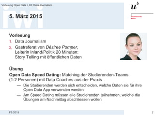 Die Vorlesung zu Datenjournalismus behandelt die Nutzung öffentlicher Daten zur Erstellung von Geschichten und Reportagen, insbesondere in Verbindung mit dem MH17-Abschuss. Es werden verschiedene Aspekte des Datenjournalismus behandelt, einschließlich Informationsbeschaffung, Datenverarbeitung und Visualisierungstechniken. Zudem umfasst die Veranstaltung praktische Übungen, wie das Speed Dating zwischen Studierenden und Data Coaches, um Datenanalyseprojekte zu initiierten.