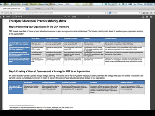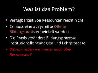Das Dokument behandelt die Herausforderung der unzureichenden Verfügbarkeit von Ressourcen im Bereich der offenen Bildungspraxis, die zur Verbesserung von Bildungsprozessen und institutionellen Strategien erforderlich ist. Es wird betont, dass die Entwicklung reifer offener Bildungspraxen notwendig ist, um die Effektivität des Lernens zu steigern. Zudem wird auf die Bedeutung von Open Educational Resources (OER) hingewiesen, die in diesem Kontext verwendet werden können.