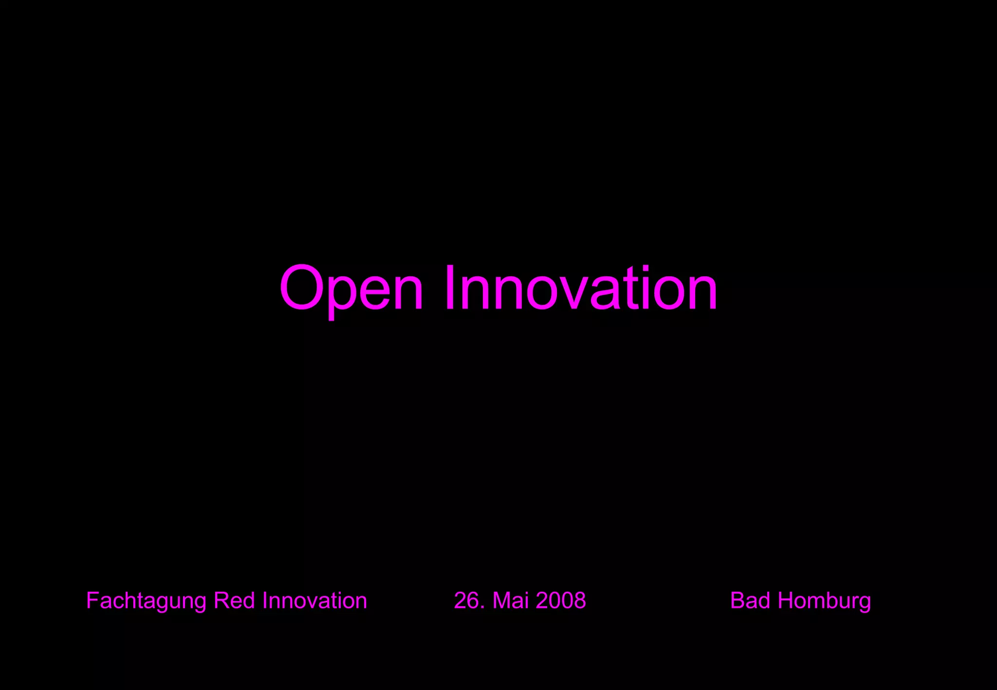 Die Fachtagung zur offenen Innovation beschäftigt sich mit der erfolgreichen Einführung von Ideen und Erfindungen in den Markt, wobei sie auf kreative Zerstörung und die Notwendigkeit von Veränderungsbereitschaft hinweist. Es werden verschiedene Ansätze zur Kooperation und Co-Creation vorgestellt, wie Inside-Out und Outside-In, die Unternehmen und andere Akteure einbinden können, um Risiken zu minimieren und kreative Potenziale zu steigern. Praxisbeispiele wie nutzerzentrierte Innovation und Plattformen wie Dell Ideastorm verdeutlichen, wie eine Beteiligung von Nutzern und Partnern den Innovationsprozess unterstützen kann.