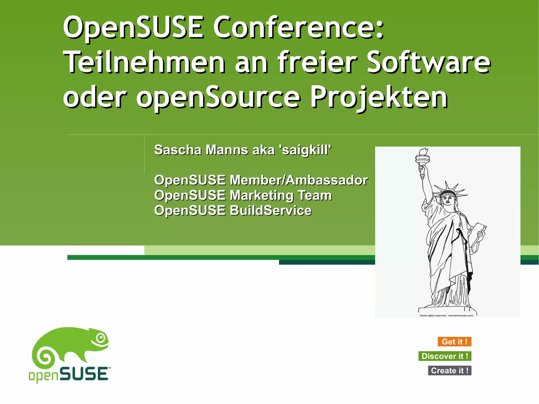 Die OpenSUSE-Konferenz bietet Informationen und Ressourcen über die Teilnahme an freien Software- oder Open Source-Projekten, inklusive Grundlagen zu lizenzierten Softwaremodellen wie GPL, LGPL, BSD und Apache. Zudem werden erste Schritte und Tipps zur Mitwirkung in Projekten sowie zur Fehlerberichterstattung gegeben, um die Beteiligung an der Community zu fördern. Es wird betont, dass Entwicklung, Dokumentation und Marketing wesentliche Bereiche sind, in denen man sich einbringen kann.