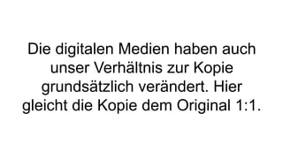 Das Dokument behandelt die Konzepte von Open Source, Open Access und Open Educational Resources, die durch digitale Medien ermöglicht werden. Es wird erläutert, wie Urheber ihre Werke unter bestimmten Bedingungen öffentlich zugänglich machen können, sowie die Entstehung von Open Access in der Wissenschaft und offene Prozesse in der Forschung. Zudem wird auf alternative Finanzierungsmodelle wie Open Money eingegangen, die die Abhängigkeit von traditionellen Währungen hinterfragen.